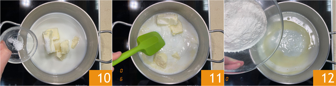 Add the salt 10 and bring to a boil over medium-low heat, stirring to dissolve everything 11. When it starts to boil, add all the flour at once 12 and stir vigorously.