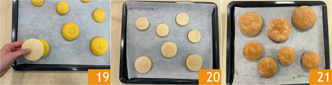 Gently place the craquelin circles on the corresponding size puffs 19. Bake in a preheated static oven at 410°F for 15 minutes, then lower the temperature to 355°F and continue baking for another 15-20 minutes. Once baked, remove them and let them cool 21.