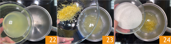Now focus on the lemon curd filling: in a double boiler, pour the lemon juice 22 and grated lemon zest 23, then add the sugar 34.