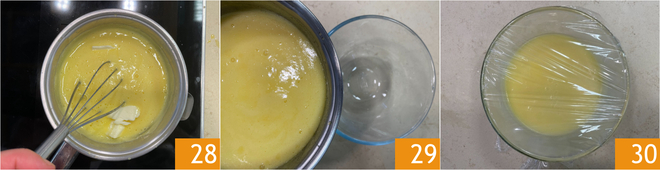Mix well to dissolve it evenly 28. Pour the lemon curd into a bowl 29, cover with cling film touching the surface, and let it cool first at room temperature and then in the fridge 30. Later, transfer the lemon curd to a piping bag with a nozzle less than 1/3 inch in size.