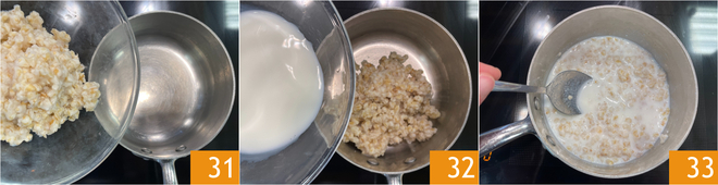 Proceed with the pastiera filling: pour the cooked wheat 31 and milk 32 into a saucepan, then bring to a simmer, stirring often 33. When the mixture has thickened, turn off the heat and let it cool.