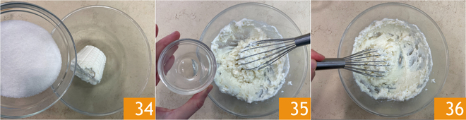 Meanwhile, combine the ricotta and sugar in a bowl 34, add the orange blossom water 35 and mix well with a whisk 36.