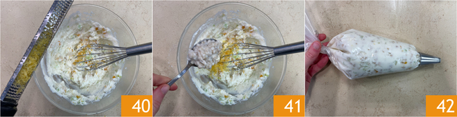 Add the lemon zest 40 and finally combine the cooked and cooled wheat 41. Mix everything and taste to adjust the intensity of the aroma to your preference. Transfer to a piping bag with a 1/3-inch plain nozzle 42.