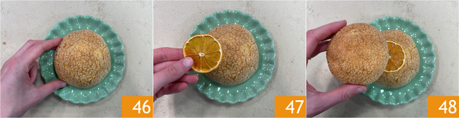 Place the pastiera puff on the plate 46, then place a slice of dehydrated orange on top 47 and crown with the lemon curd puff 48.