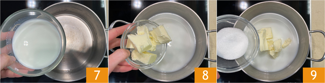 In the meantime, start with the choux pastry: pour the water and milk into a saucepan 7, then add the butter 8 and sugar 9.