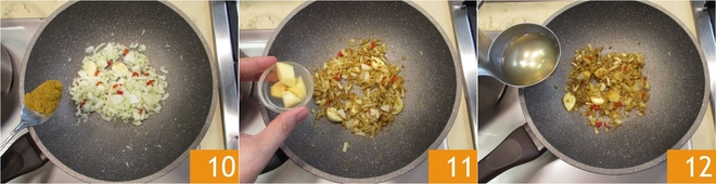 Season with curry 10, chili pepper, and ginger 11, then pour a ladle of flavored water 12.