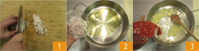 To make the monkfish in broth, first start by preparing the sauce. Clean and chop the shallot 1. In a saucepan, pour the finely chopped shallot, oil, and garlic 2. Stew the shallot over low heat for about 5-6 minutes. Pour in the tomato sauce 3