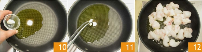 In another pan, pour a drizzle of oil and the garlic, heat over low heat to flavor 10. Remove the garlic 11 and place the monkfish bites 12.