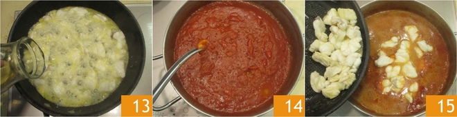 Splash with white wine 13 and let it evaporate. Meanwhile, remove the garlic clove from the sauce 14 and add the fish 15.