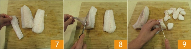 and remove the central bone 7. Remove any skin residues 8 and cut it into pieces of the same size, about an inch 9.