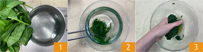 To make the monstrous savory brioche bread, first blanch the spinach for a few moments in boiling salted water 1, then drain them into a bowl of cold water 2. Drain the spinach and squeeze them well 3.