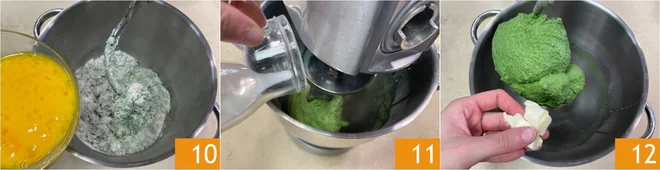 Pour the flour into the bowl of a stand mixer equipped with a hook, then add the dry yeast 7, sugar 8, and spinach cream 9.