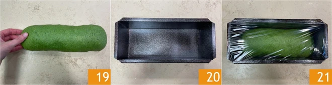 After the rising time 16, stretch the dough with your fingertips to form a rectangle 17, then roll it up from the longer side 18.
