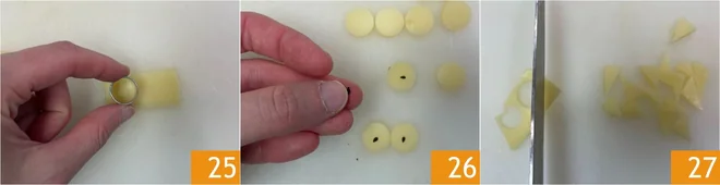 In the meantime, prepare the decorations: cut out cheese discs with a small circular cutter 25 and place a black sesame seed in the center for the eyes 26, then cut small triangles for the teeth 27.