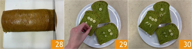 Once cooled, slice the brioche bread into slices about 1 1/4 inches thick 28 and decorate each slice as you like with the cheese teeth and eyes 29. Your monstrous brioche bread is ready to be served 30!