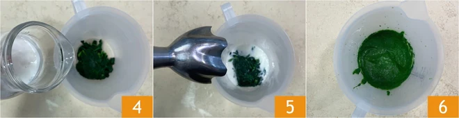 Transfer 3.5 oz (100 g) of cooked and squeezed spinach into a container, add 3.5 oz (100 g) of milk 4, and blend with an immersion blender 5 to obtain a smooth and homogeneous cream 6.