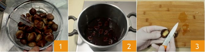 To prepare Mont Blanc, start by washing the chestnuts under running water 1: cut them one by one with a knife blade, then place them in a pressure cooker, cover with water to the brim 2, and cook for about 10 minutes (if boiling in a pan, it will take at least 30 minutes for them to cook). Then turn off the heat, wear disposable kitchen gloves and take one chestnut at a time to peel it 3; this way the others will stay warm and it will be easier to peel them.