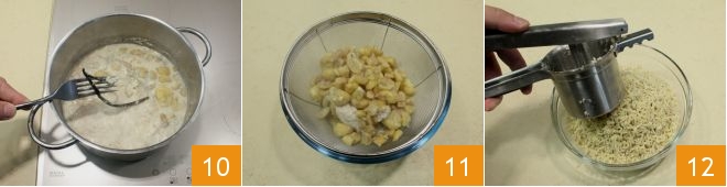 After this time, remove the vanilla bean 10 and drain the chestnuts with a sieve 11, then pass them through a potato ricer and collect the puree in a bowl 12.