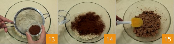 Incorporate the sifted cocoa powder directly into the bowl 13 and the rum 14. Mix with a spatula 15 to compact the dough, which will be dry.
