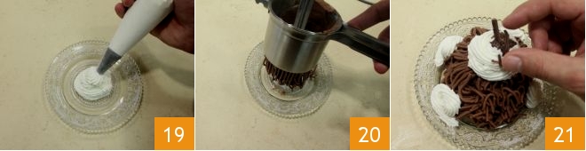 Take a serving dish, place a dollop of whipped cream at the bottom 19, then, using a potato ricer with large holes, pass the chestnut, chocolate, and rum mixture 20 forming a mound. Decorate it with more whipped cream to create a white peak 21 and garnish as desired with other whipped cream dollops, chocolate shavings 21, or marron glacé.