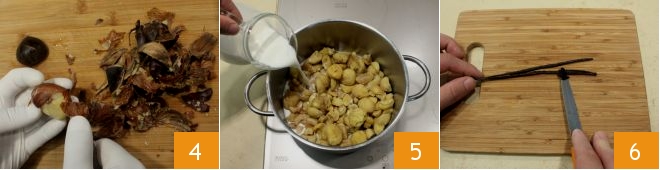 Remove the inner skin from all the chestnuts 4. Then place the peeled chestnuts in a saucepan and cover them with milk 5; slice open a vanilla bean and extract the seeds 6;