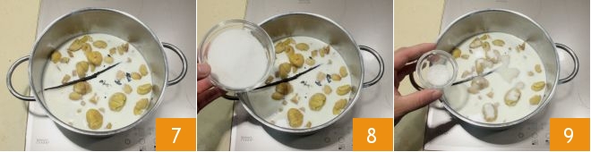 add them to the chestnuts along with the whole bean 7. Add the sugar 8 and salt 9 and boil for about 20 minutes.