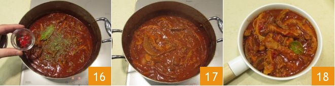 20 minutes before the end of cooking, season the Morzello with the herbs: bay leaf, oregano, and chopped chili pepper 16. After the indicated time, the Morzello will be ready to serve (17-18).