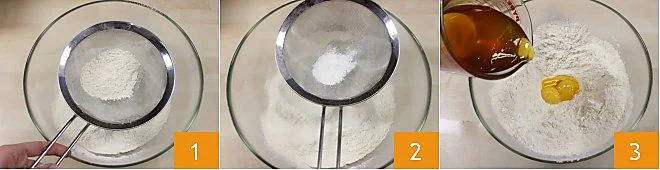 To prepare the Calabrian mostaccioli, first sift the flour into a bowl 1, along with the yeast 2. In the center, add the egg yolks and part of the honey 3