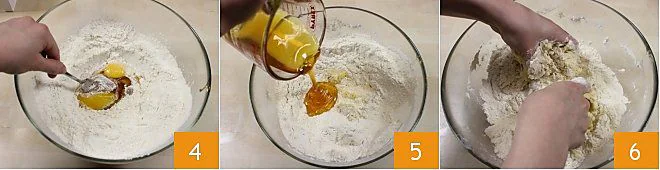 then start whisking with a fork to gather the ingredients 4 and add the remaining honey 5. Adding the honey in several stages will make it easier to work with the dough, but if you are more experienced you can add all the ingredients at once and start kneading right away. Knead the ingredients with your hands 6 and if necessary, add more flour.