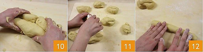 Continue this way until you get a homogeneous and compact dough 10. Divide the dough into parts of 5 oz each 11, about 7 parts, and keep the leftover dough for the decorations. If you like, you can make smaller or larger mostaccioli. Shape each piece into a loaf 12 about 12 inches long and flatten it a bit with your hands so that it is about 1.5 inches wide and 0.75 inches high.