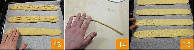 Place the mostaccioli on a baking sheet lined with parchment paper 13. With the remaining dough, form small thin loaves 14 or balls and create decorations to place on the surface 15.