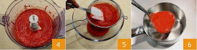 You should obtain a smooth puree 4, which you will then pass through a sieve 5 to remove any lumps and larger seeds: this will yield about 14 oz of strawberry puree. Take two/three tablespoons of strawberry puree and heat it in a saucepan 6,