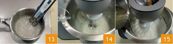 the syrup should not exceed 348°F (you'll need to measure with a kitchen thermometer); when the temperature reaches around 185°F, start working the egg whites with a stand mixer (or with an electric mixer) 13 and when they turn white, add the strained lemon juice 14. When the syrup reaches 348°F and at the same time the egg whites are well whipped, pour it slowly over the egg whites while continuing to work them at medium speed 15; continue to beat until the mixture becomes completely cool.