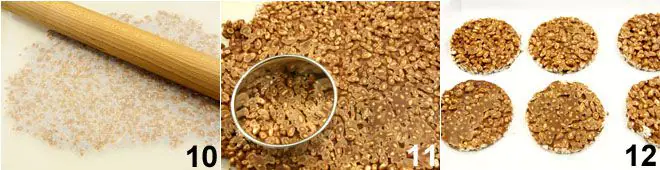 Distribute the mixture with a spoon between two sheets of parchment paper, spread it well, and level it with a rolling pin 10, then let it set in the refrigerator for about half an hour; then use a round pastry cutter to obtain circular shapes the same size as the mousse 11, you will get chocolate and puffed rice circles that will garnish the mousse 12. At this point, you can assemble the hazelnut mousse and heart with 5 hops by placing the chocolate and puffed rice circle in the center of the plate, then unmold the mousse on top of it and decorate with mixed berries and chopped hazelnuts!