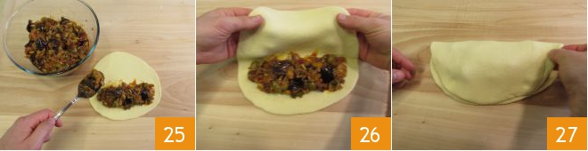 On one half of the disc, place a few spoonfuls of caponata, leaving about an inch from the edge 25. Then fold it in half like a half-moon 26 and pinch the edges 27