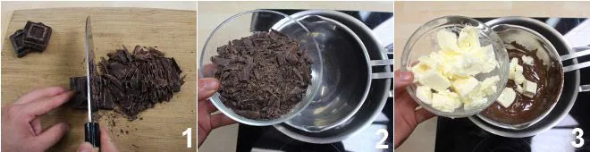 To prepare the mud cake, start by coarsely chopping the dark chocolate 1. Melt it in a bain-marie 2 and when it has melted, add the butter in pieces 3 and let it melt.