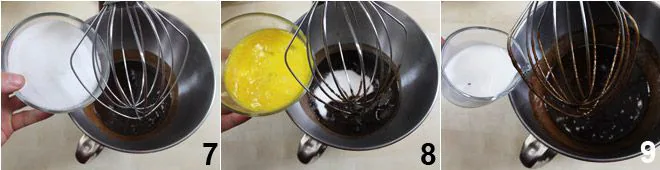 Finally, sift the flour directly into the bowl 10 along with the baking powder and cocoa powder 11 and mix with a wooden spoon or spatula to combine the mixture 12.
