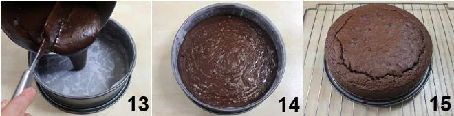 Butter and line with parchment paper a 9-inch diameter cake pan, then pour the batter evenly 13 14. Bake at 320°F (static oven) for 60 minutes, after which check the doneness with a toothpick. Let the mud cake cool on a wire rack 15.