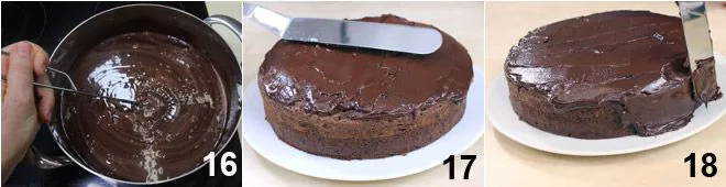 The mud cake can be served as is or covered with a chocolate ganache: heat the cream in a saucepan and when it almost reaches a boil, turn off the heat, add the chopped dark chocolate, and stir with a whisk to melt the chocolate 16. Pour the ganache into a fairly wide container and place it in the refrigerator to cool, stirring occasionally, until it reaches a 'spreadable' consistency. At this point, spread it on the mud cake and smooth it with a spatula on the surface 17 and the sides 18. If desired, you can also create ganache tufts for decoration. Your mud cake is ready!