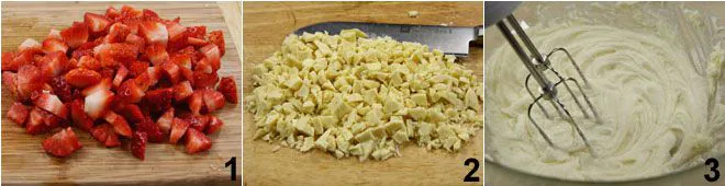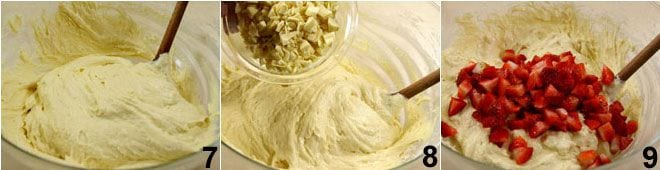mixing well with a wooden spoon until you get a smooth, lump-free batter 7. Then incorporate the white chocolate 8 and the strawberry pieces 9.