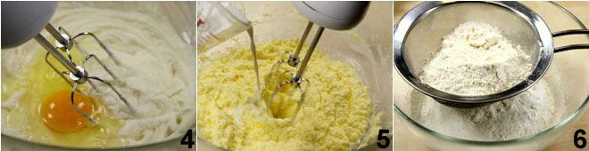 Add the 3 eggs one at a time 4, still working with the whisk, and the milk slowly 5. Sift together the flour, baking powder, baking soda, the seeds of a vanilla pod, and a pinch of salt, and incorporate everything into the mixture 6,