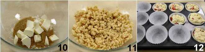 Focus on preparing the crunchy topping: in a bowl, place the cold butter from the refrigerator in small pieces, brown sugar, and flour 10 and mix the mixture coarsely with a wooden spoon or with your fingers to obtain crumbles (like a crumble) 11. Fill 14 muffin molds lined with paper liners with the batter up to half a centimeter from the edge 12. Then cover the muffins with the crumbles and bake them at 350°F for about 35/40 minutes (do the toothpick test to check their cooking). When the strawberry and white chocolate muffins are golden, take them out of the oven and let them cool before enjoying.