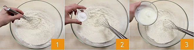 To prepare spelt muffins with strawberries and almonds, in a bowl mix the spelt flour and raw cane sugar with the help of a whisk 1. Then add the baking powder 2 and yogurt 3,