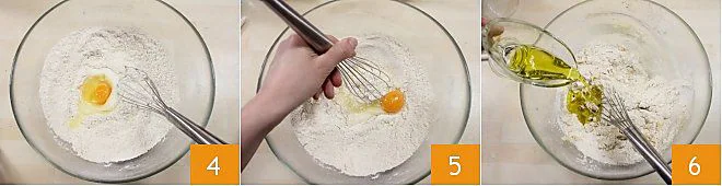 next break the eggs and add them 4, then mix with the whisk 5. Finally, pour in the extra virgin olive oil slowly 6 and blend the ingredients well.