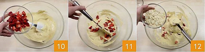 Add the strawberries to the muffin batter 10, give it a stir 11, and lastly add the sliced almonds 12. Remember to set aside a handful of both strawberries and almonds for the final decoration.