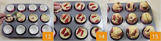 In a muffin tin, place the liners and fill them to 3/4 of their height with the batter 13; add a couple of strawberry pieces and almond slices on top of each muffin 14 and bake the spelt muffins in a preheated oven at 356°F for 20-25 minutes (if using a fan oven, 320°F for 15-20 minutes). Take the spelt muffins with strawberries and almonds out of the oven 15, let them cool on a wire rack, and serve them!