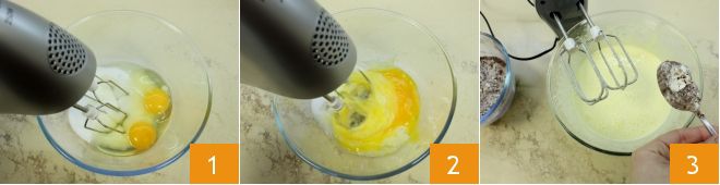 To prepare the mug cake, start by beating the eggs with the sugar using an electric whisk (1-2) or a hand whisk: you need to obtain a white and frothy mixture. In a bowl, sift and mix the flour, unsweetened chocolate powder, and baking powder. Gradually add the dry ingredients to the egg and sugar mixture 3, alternating with the milk.