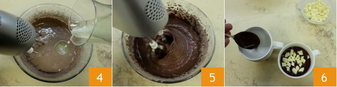 Once the ingredients are combined, continue mixing with the whisks and slowly add the oil 4; continue working the mixture 5 until you get a smooth and homogeneous batter. Then transfer it to the mugs 6, leaving about 1/2 inch from the edge (to prevent the batter from overflowing during cooking).