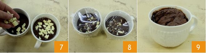 Add the white chocolate pieces 7, then cover the mugs with microwave-safe plastic wrap 8 (the wrap helps prevent the cake from rising too much during cooking; you can omit it and pour less batter into the cup, adjusting with one for the right amount to use). Then, cook them in the microwave at 600 watts (or at the maximum power of your microwave) for about 1-2 minutes; you'll need to adjust based on your microwave, which is essential for this preparation. If you prefer a texture more like a cake, you can keep the mug cake in the microwave for a few more seconds; if you prefer it similar to a soufflé, the indicated time will suffice. When the mug cake is ready, remove it 9 and let it cool.