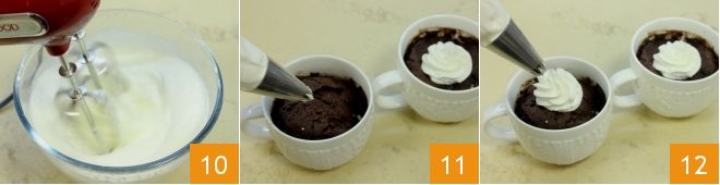 Meanwhile, whip the cream with well-chilled whisks and bowl 10, then transfer it to a piping bag with a star tip. When the mug cakes are completely cool, decorate them with dollops of whipped cream (11-12). Serve the mug cake as a delicious dessert or snack!